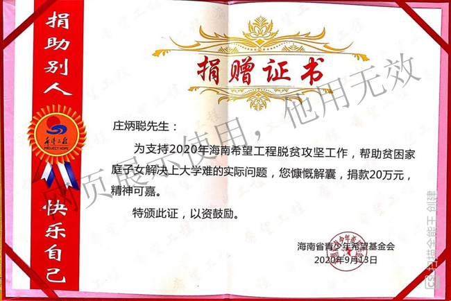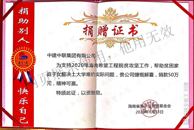 2020年9月中建中聯集團有限公司及莊炳聰個人向海南省青少年希望基金會“海南希望工程公益項目”捐款合計人民幣柒拾萬元整。