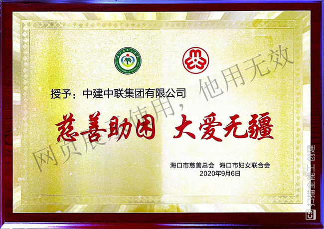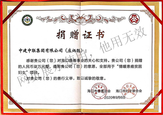 2020年9月中建中聯集團有限公司向海口市慈善總會“情暖癌癥,貧困婦女”捐款合計人民幣柒萬元整。