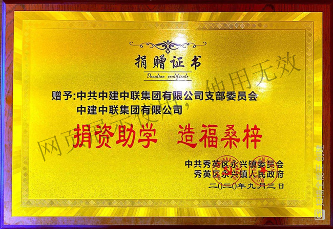 2020年9月中建中聯集團有限公司、中共中建中聯集團有限公司支部委員會向中共秀英區永興鎮委員會“捐資助學·造福桑梓”捐款合計人民幣陸萬元整。