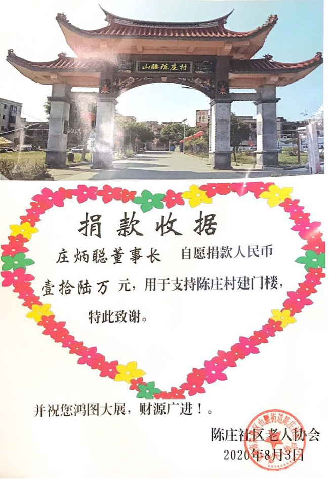 2020年9月中建中聯集團有限公司及莊炳聰個人向泉州市泉港區山腰街道陳莊社區老年人協會“陳莊村建門樓”捐款合計人民幣壹拾陸萬元整。