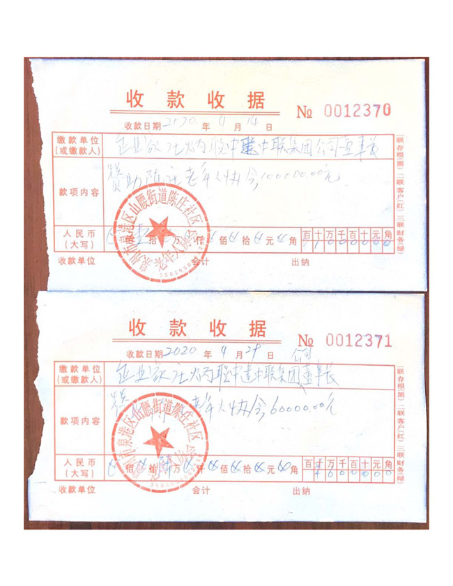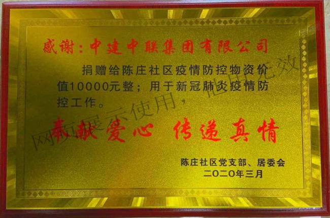2020年2月中建中聯集團有限公司向陳莊社區黨支部、居委會“新冠肺炎疫情防控工作”捐款合計人民幣壹萬元整。