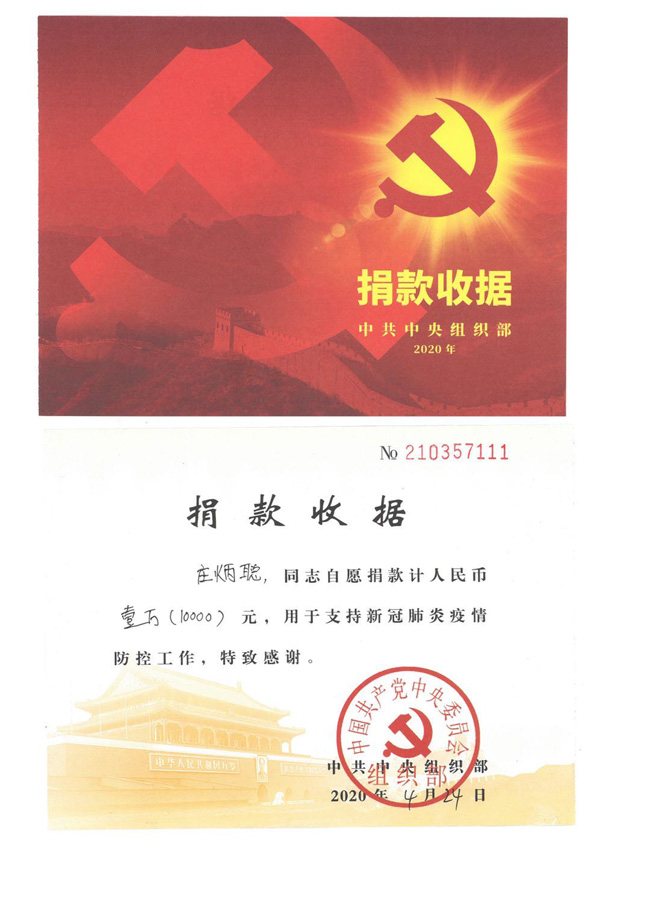 2020年4月莊炳聰向中國共產黨中央委員會組織部“新冠狀肺炎疫情防控工作”捐款合計人民幣壹萬元整