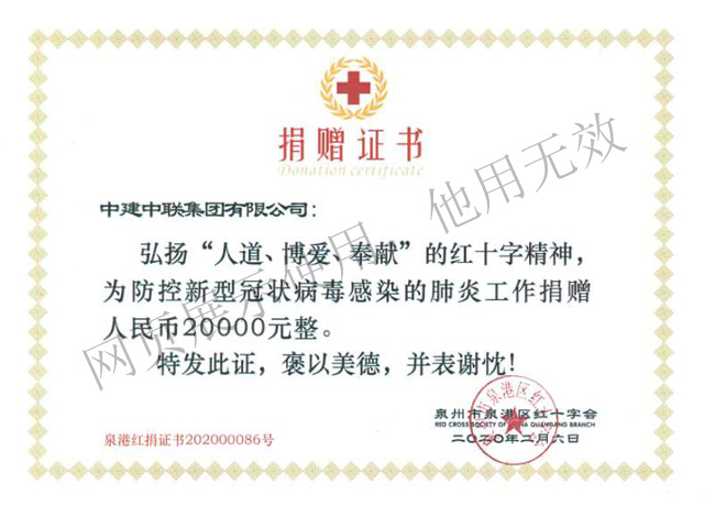2020年2月中建中聯集團有限公司向泉州市泉港區紅十字會“防控新型冠狀病毒感染的肺炎工作”捐款合計人民幣貳萬元整。