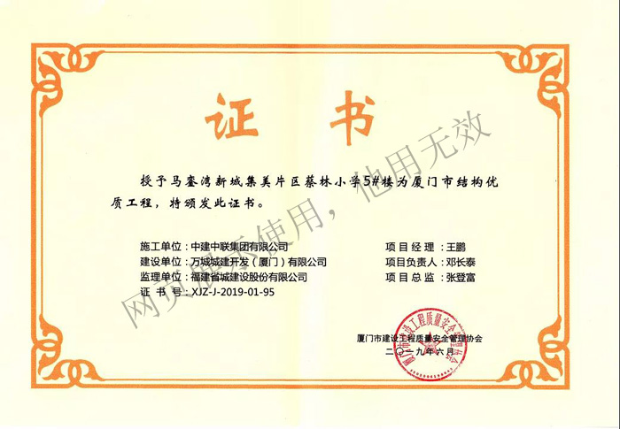 我會(huì)黨支部書記兼常務(wù)副會(huì)長(zhǎng)單位中建中聯(lián)集團(tuán)有限公司近年來(lái)努力開創(chuàng)省外建筑業(yè)務(wù)市場(chǎng),公司承建的廈門市馬鑾灣新城集美片區(qū)蔡林小學(xué)5#樓項(xiàng)目己通過(guò)廈門市結(jié)構(gòu)優(yōu)質(zhì)工程嚴(yán)格的考核評(píng)審程序,最終榮獲了“廈門市結(jié)構(gòu)優(yōu)質(zhì)工程”證書。該獎(jiǎng)項(xiàng)是對(duì)項(xiàng)目工程質(zhì)量的重要肯定,也是對(duì)項(xiàng)目團(tuán)隊(duì)付出辛苦工作的肯定,在質(zhì)量和安全方面均得到建設(shè)單位和質(zhì)量監(jiān)督等部門一致好評(píng)!