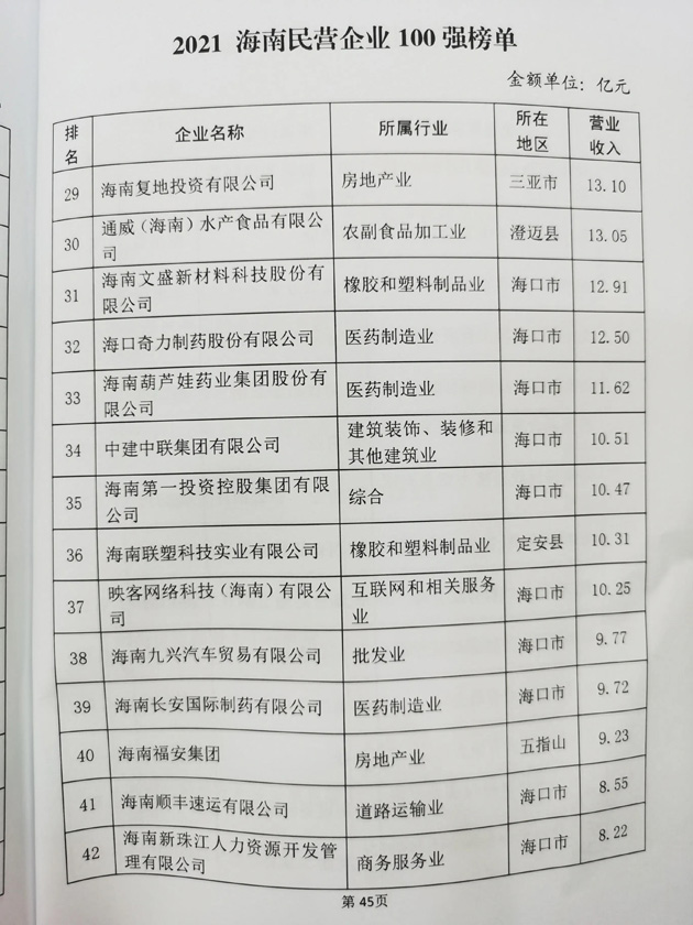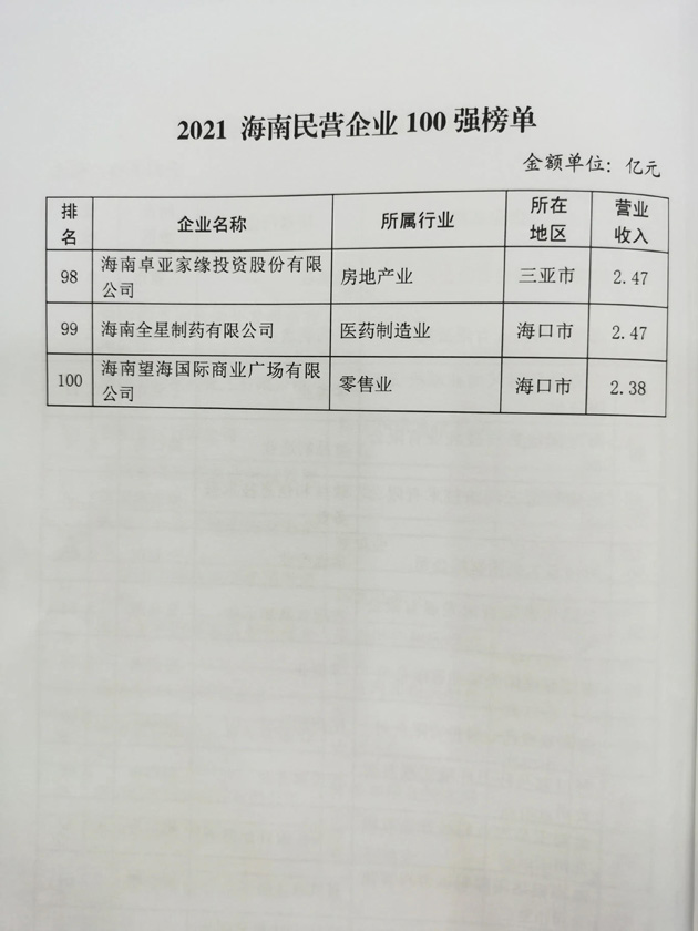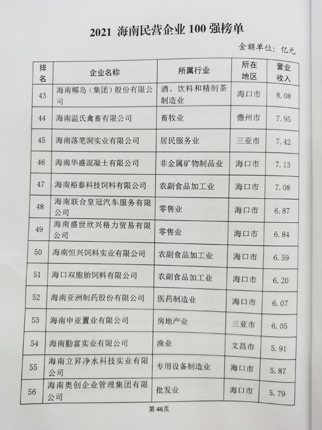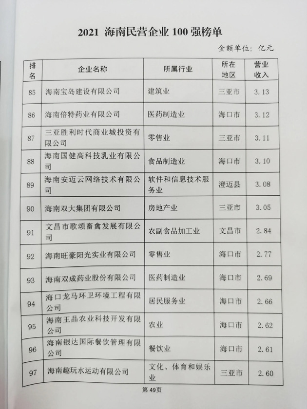11月4日,2021年海南省民營企業(yè)100強(qiáng)榜單在??诎l(fā)布。 2020年,海南民營企業(yè)100強(qiáng)的營業(yè)收入總額達(dá)1455億元,戶均14.55億元,較上年增長19.96%(2019年為1212.9億元),入圍門檻為2.38億元。
